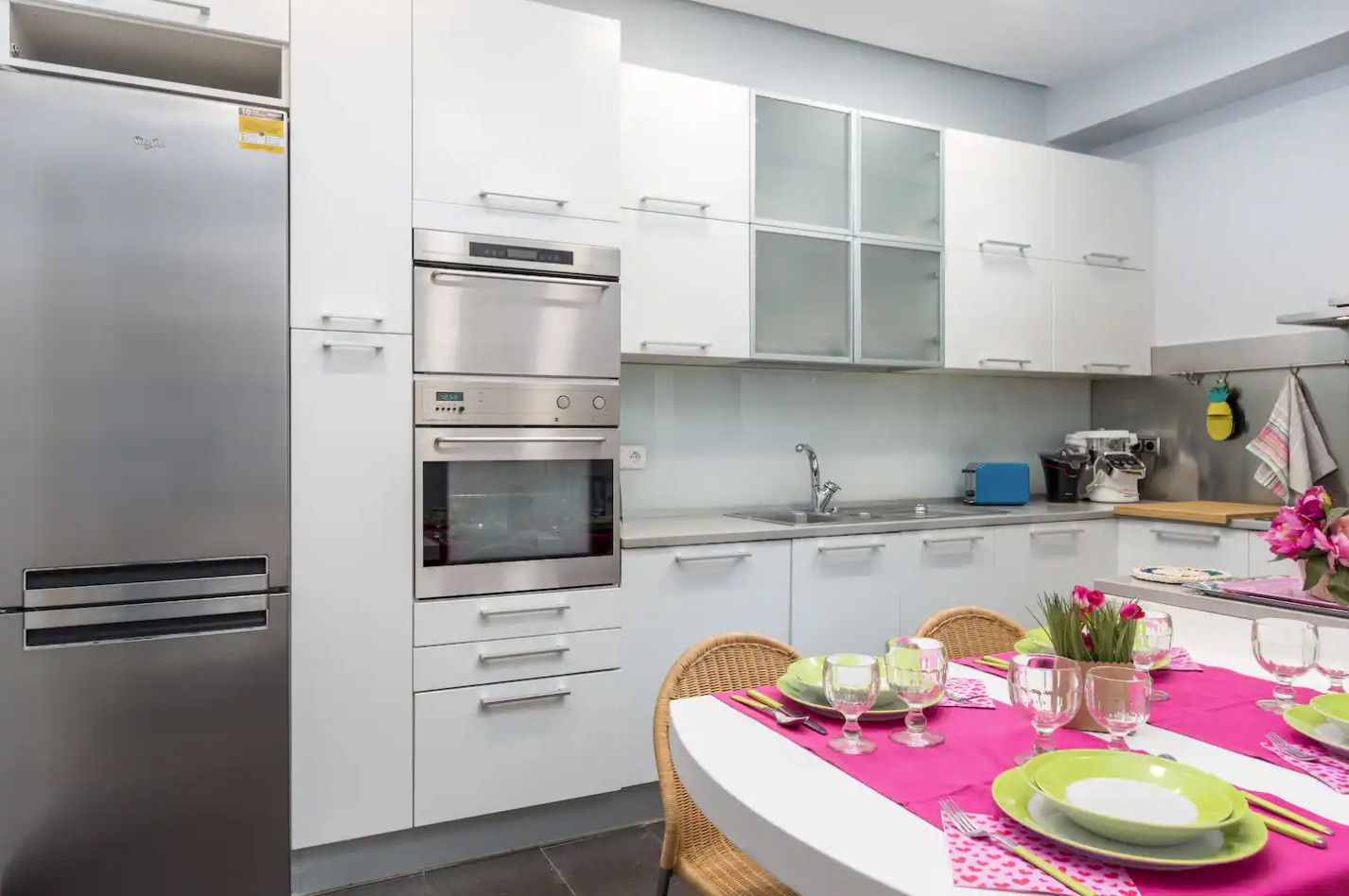 La cuisine indépendante, à induction, est équipée avec réfrigérateur, micro-ondes, four, congélateur, lave-vaisselle, vaisselle/couverts, ustensiles/cuisine, cafetière, grille pain, bouilloire et presse-agrumes.
